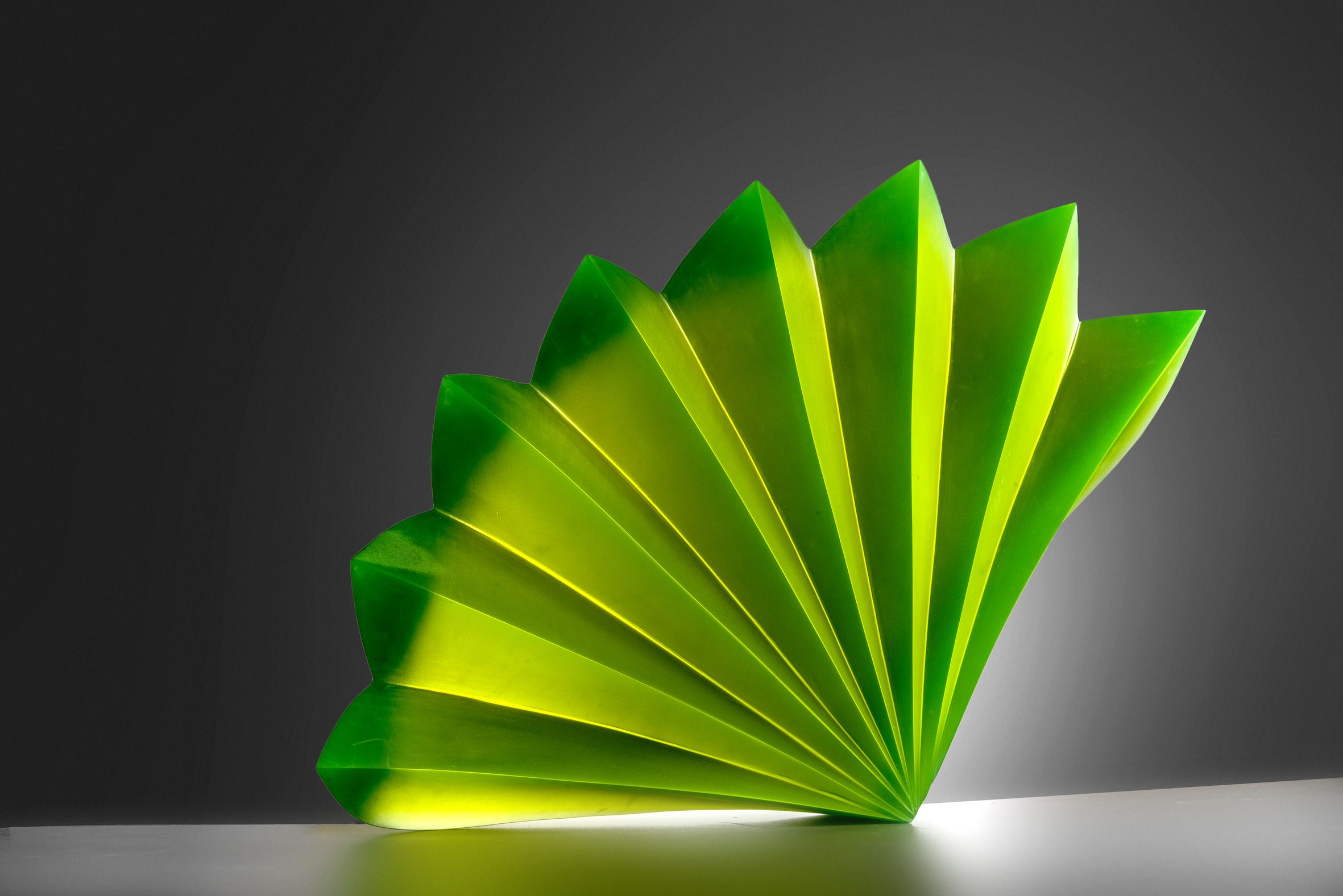 Beim geschmolzenen Glas ist es die Arbeit mit Farbe und Licht, die Veränderung der Farben je nach Materialstärke, die sie besonders fasziniert. Aus dieser Verbindung von Licht, Bewegung und natürlichen Formen entstehen ihre farbenfrohen Glasskulpturen.
