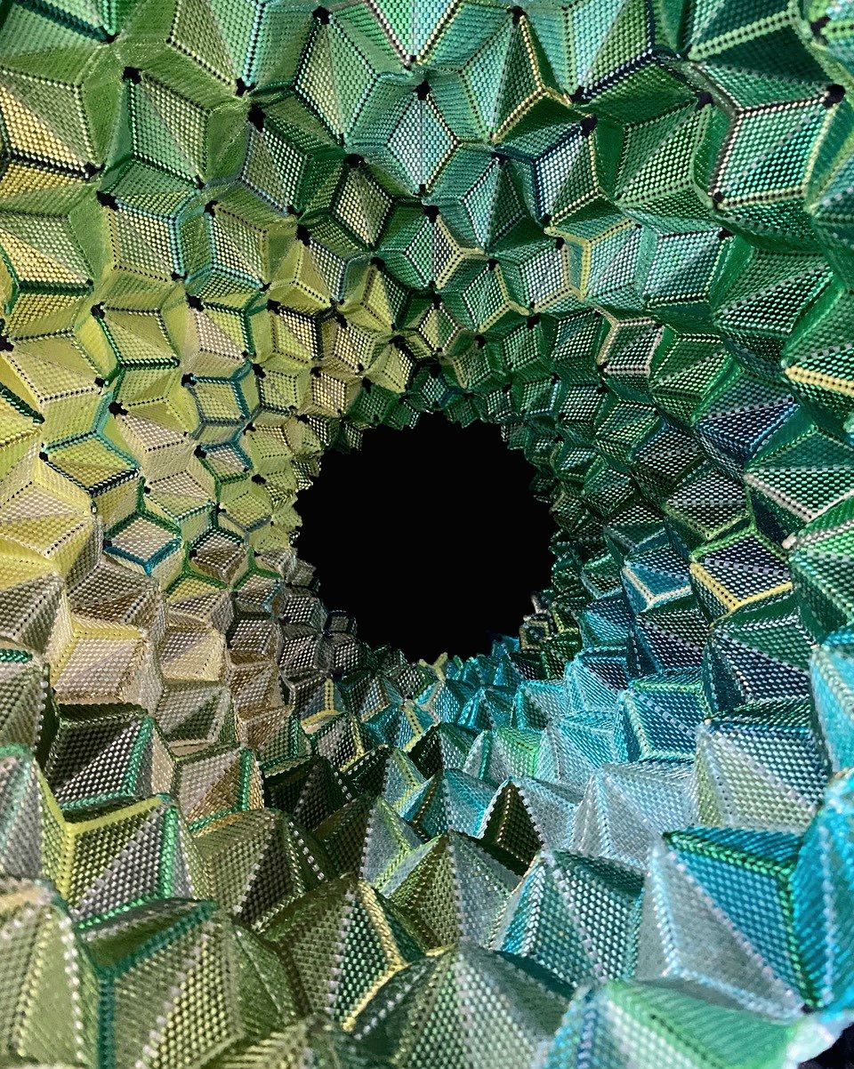 Der japanische Objektkünstler Shige Fujishiro fertigt seine Arbeiten aus unzähligen, farbigen japanischen Toho-Glasperlen, die er in oft monatelanger, minutiöser Feinarbeit auf Sicherheitsnadeln fädelt und miteinander verknüpft. Auch eines seiner großartigen Objekte konnte für die Sammlung erworben werden, genau wie viele andere, spannende Arbeiten.