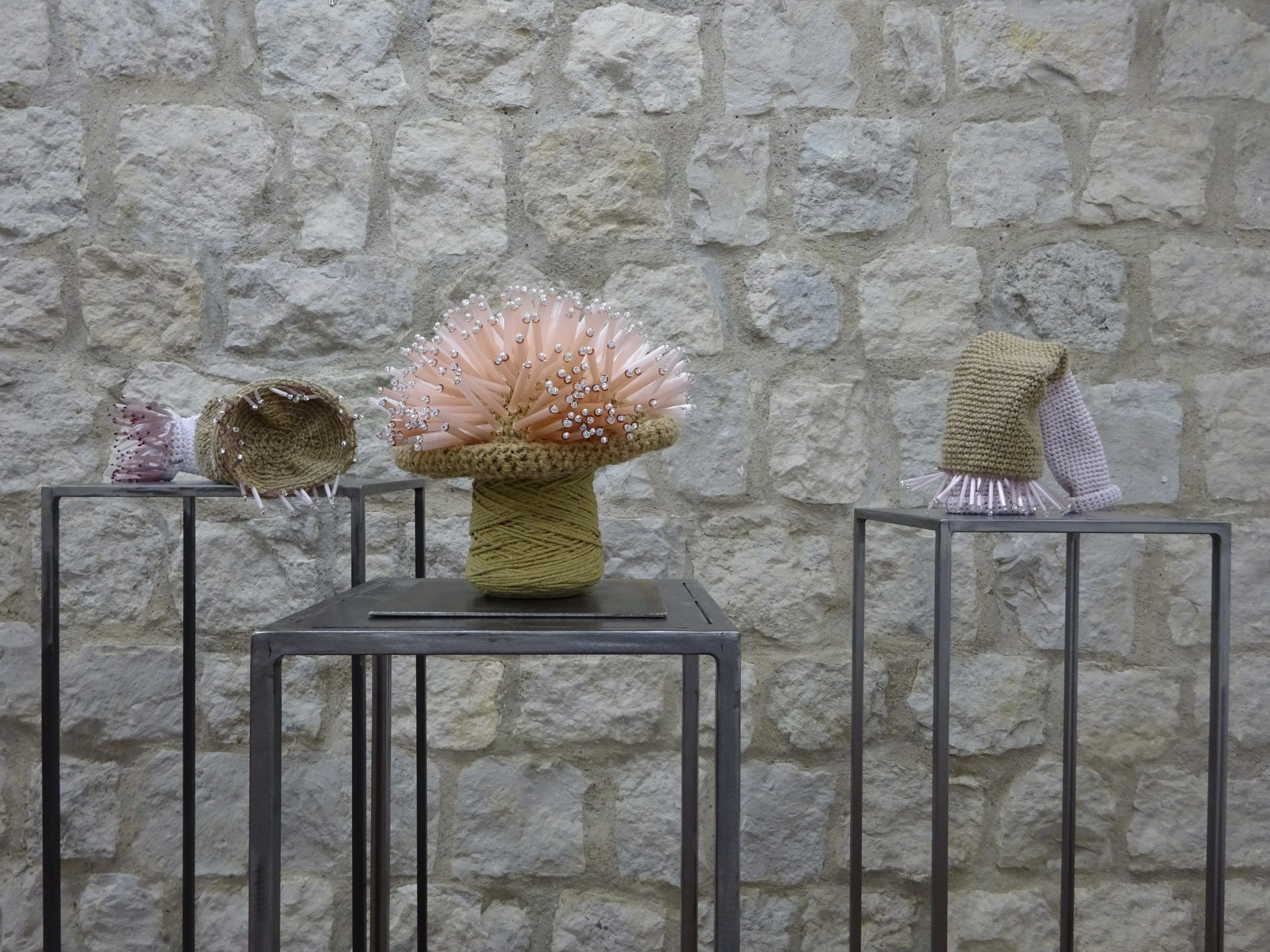 Ihre Arbeit ist geprägt von der Überzeugung, dass schöpferische Leistung stets aus dem Zusammenspiel von Kreativität und handwerklichem Können entsteht – ein Ansatz, der auch in ihrem Studium des Textildesigns verwurzelt ist. Glas eröffnet ihr dabei eine besondere Vielfalt an Ausdrucksmöglichkeiten. Sie kombiniert das fragile, glatte Material mit Gegenspielern wie Metall oder Textil und erzeugt so spannungsreiche Kontraste. In ihren Arbeiten treffen klare Glaselemente auf schlammfarbenes, raues Jutegewebe. Die gegensätzlichen Oberflächen gehen eine Art Symbiose ein: Die gleichmäßig gehäkelten Flächen erinnern an Korallenstrukturen, wirken organisch und lebendig, während das Glas Kühlung und Distanz einbringt. Sparsam eingesetztes Glas in Verbindung mit einem dominanten Textilkörper strahlt etwas Schutzwürdiges aus, zugleich wird diese Schutzfunktion durch die Zerbrechlichkeit des Materials infrage gestellt. In dieser Ambivalenz liegt eine zentrale Aussage ihrer Werke: Sie erinnern daran, wie verletzlich unsere Umwelt ist und wie dringend sie bewahrt werden muss.